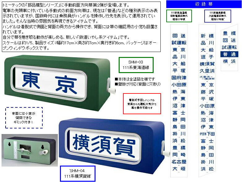 トミーテック SHM-03手動前面方向幕111系東海道線 【鉄道模型・Nゲージサイズ】【ポイント倍付0401】 価格: 2,352円 レビュー評価: 0.0 レビュー数:0 トミーテック・TOMYTEC・鉄道模型・Nゲージ・電車模型・部品模型シリーズ商品名【鉄道模型・Nゲージサイズ】 トミーテック SHM-03手動前面方向幕111系東海道線詳細トミーテックの「部品模型シリーズ」に手動前面方向幕第2弾が登場します。電車の先頭車に付いている手動式の前面方向幕は、現在は「普通」などの種別表示のみ表示されていますが、国鉄時代には乗務員がハンドルを操作し行先を表示して運用されていました。そんな当時の雰囲気を再現できるアイテムです。ハンドルは着脱式で側面と背面の両方から操作でき、背面には幕の確認用の小窓も設置されています。自分で幕を巻き取る動作が楽しめる、新しい「鉄道いやし系 Supported by 楽天ウェブサービス |